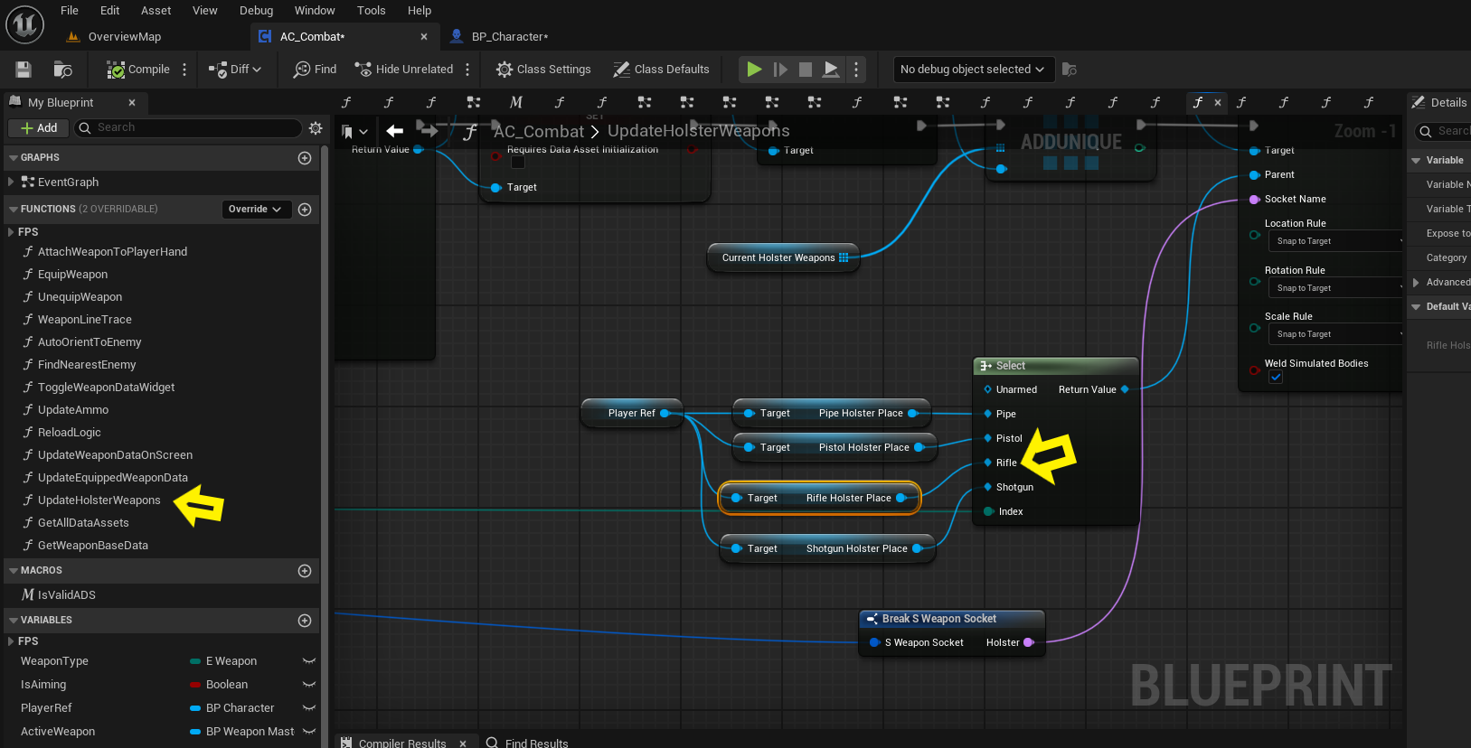 In the Character class, add a new HolsterPlace for the rifle (similar to what we have for the shotgun) and assign a unique socket for it on the character mesh. After that, go to AC_Combat and add the rifle to the selector inside the UpdateHolsterWeapons function so it knows where to attach when another weapon is equipped.