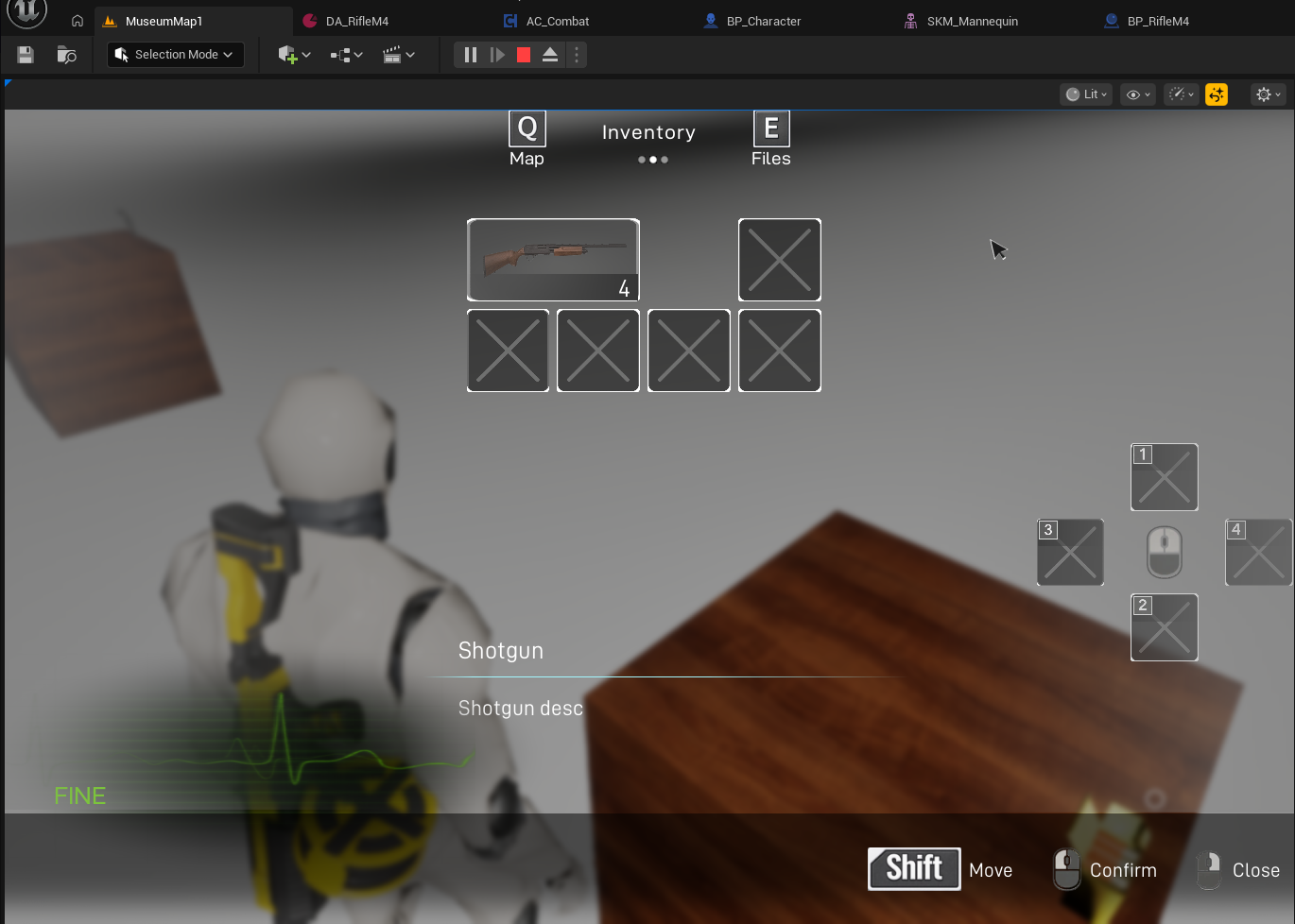Next, in AC_Combat, in the Action section, add the rifle to the branch according to the provided screenshot. Then, in the Inspect Object section in the character class, add the rifle to the selector in both areas as shown in the screenshot.