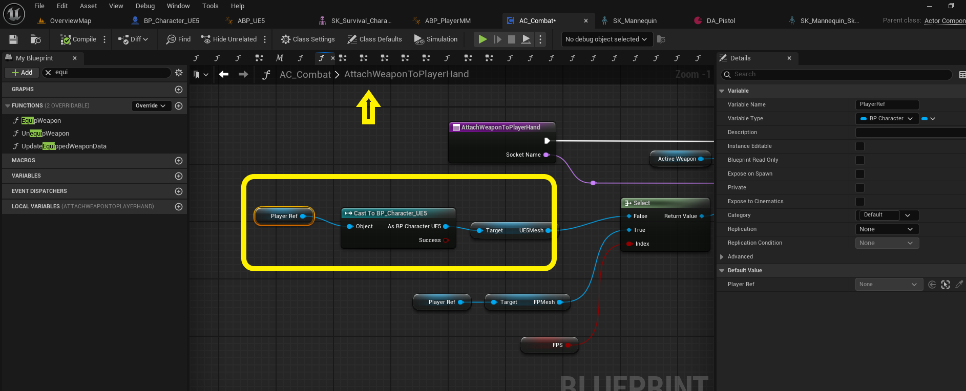 Finally, you need to go into "AC_Combat" and make a small change in the "AttachWeaponToPlayerHand" function. I’ve sent you an image showing exactly what to do. If you created a child class of "BP_Character" for your UE5 character and are not using the main character class, you should cast there; otherwise, just get your UE5 mesh. This will solve your problem.