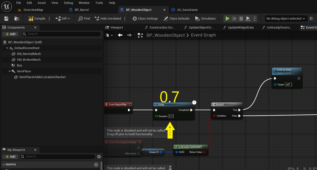 @makiru thank you for your helpful topic! It looks like your Load function has a delay of about 0.5. The BP_WoodenObject class checks the load state after about 0.2 seconds, so it’s possible that the load data hasn’t been received yet when that check happens. This could be the reason why the broken crates are not updating correctly.